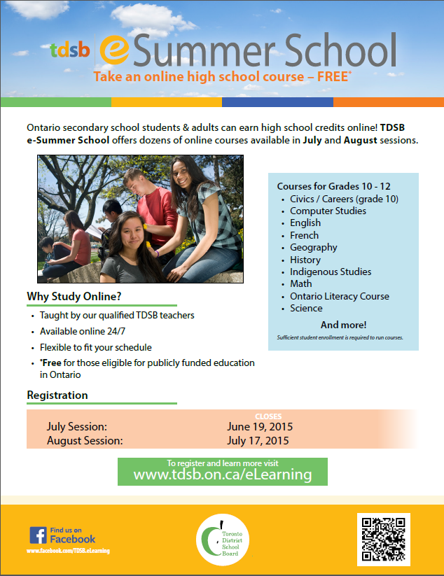 E summer july registration closes june 15 2020 at 4 30 pm supporting documentation transcript report card or credit counselling summary for non tdsb students must be submitted by june 16 2020 at 12 30 pm welcome message to students you will receive information via. For more information please visit the e summer credit website. Tdsb e summer school offers dozens of online courses available in july and july august sessions. The e learning department is offering a fully online e summer program for tdsb and non tdsb secondary school students in both july and august.